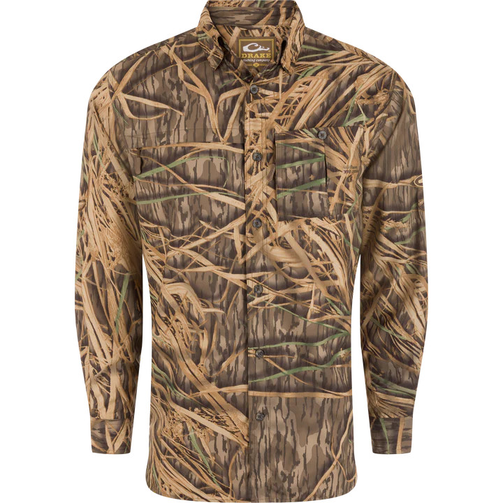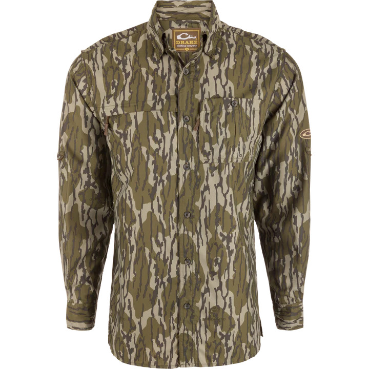 The Drake Long-Sleeved Flyweight Camo Hunting Shirt is made from 100% Polyester Dobby fabric featuring our exclusive Old School Camo pattern. The performance fabric is featherweight at 71 GSM which allows moisture to wick quickly from the body. It also has a UPF30 rating for sun protection and has a natural stretch for ease of movement. This shirt has a classic fit, a hidden button-down collar, and a vented cape back. The Long-Sleeved Flyweight Camo Hunting Shirt features a right chest pocket with a horizontal hidden zipper and a button through the left chest pocket with a hidden vertical zipper. It has a split tail hem which allows you to wear tucked or untucked and has an adjustable tab if you want to roll up your sleeves. Classic styling and technical features will make the Long-Sleeved Flyweight Camo Hunting Shirt one of your soon-to-be favorites.