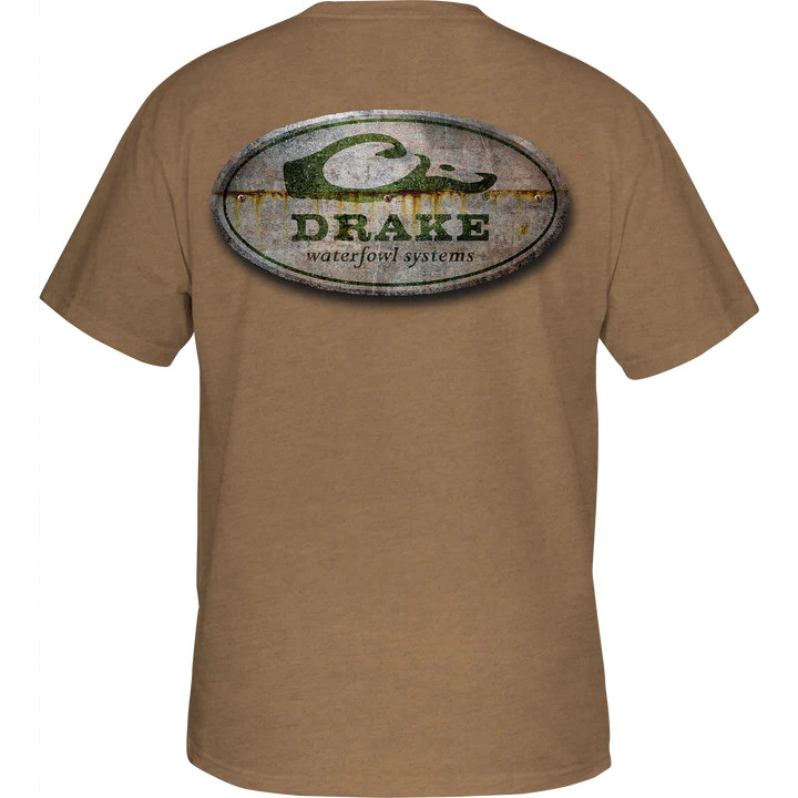 The Drake Waterfowl Graphic Tee is constructed with a 60% cotton and 40% polyester blend, which supplies softness and comfort. It has a Drake logo on the front pocket and features our classic Drake Logo on a distressed metal sign from our Drake Logo Series of back graphic tees.