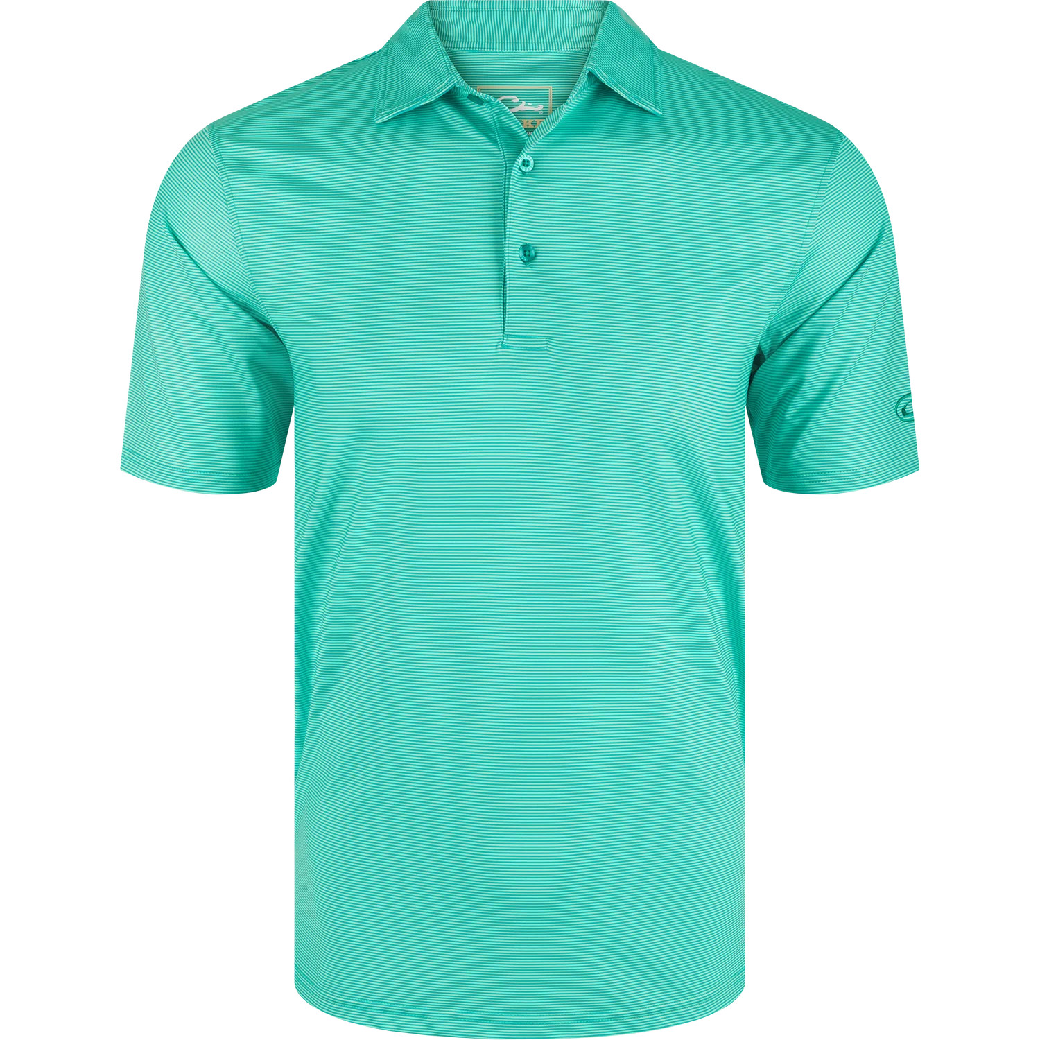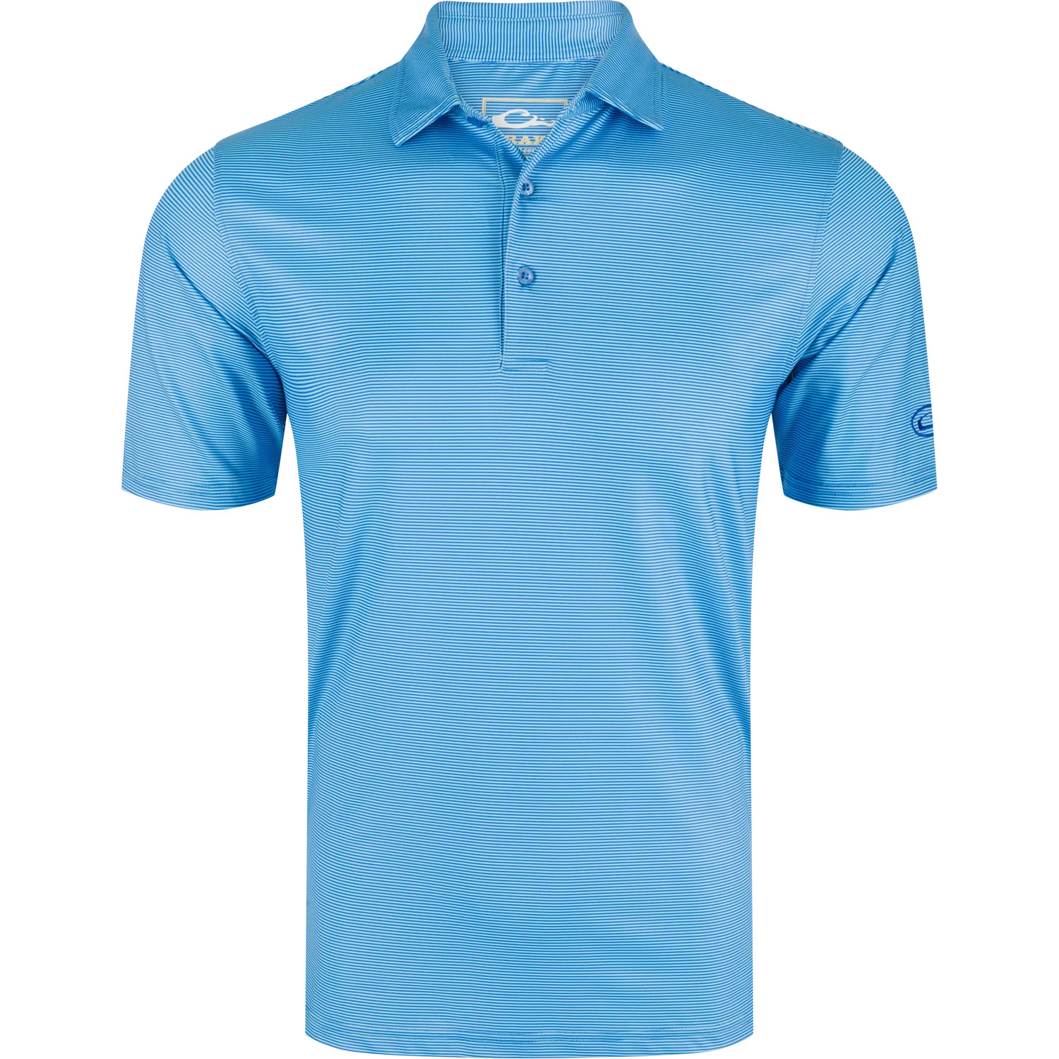 The Drake Performance Chalk Stripe Polo is timeless in silhouette with a three-button placket with dye to match logo buttons, a self-fabric collar, open sleeve cuffs, and a split tail hem. The performance fabric has a UPF 30 rating for sun protection and has built-in stretch for ease of movement and is moisture-wicking to help keep you cool and dry. The combination of performance and classic styling makes the Drake Chalk Stripe Polo an excellent choice on the course or at the office.