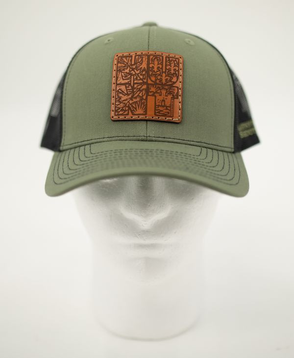 Bring a touch of Louisiana’s wild beauty to your everyday style with these leather patch trucker hats. Featuring a richly detailed etched leather patch inspired by the bayou’s natural scenes, these hats celebrate the landscapes and traditions that make our state unique. Available in two classic color combinations—olive green with black mesh and earthy brown with cream mesh—each cap offers a comfortable fit, breathable mesh back, and a pre-curved bill to keep the sun at bay whether you’re out on the water, in the woods, or enjoying a day in town. A perfect blend of rugged durability and Southern charm, these hats are made for those who carry a piece of Louisiana wherever they go.