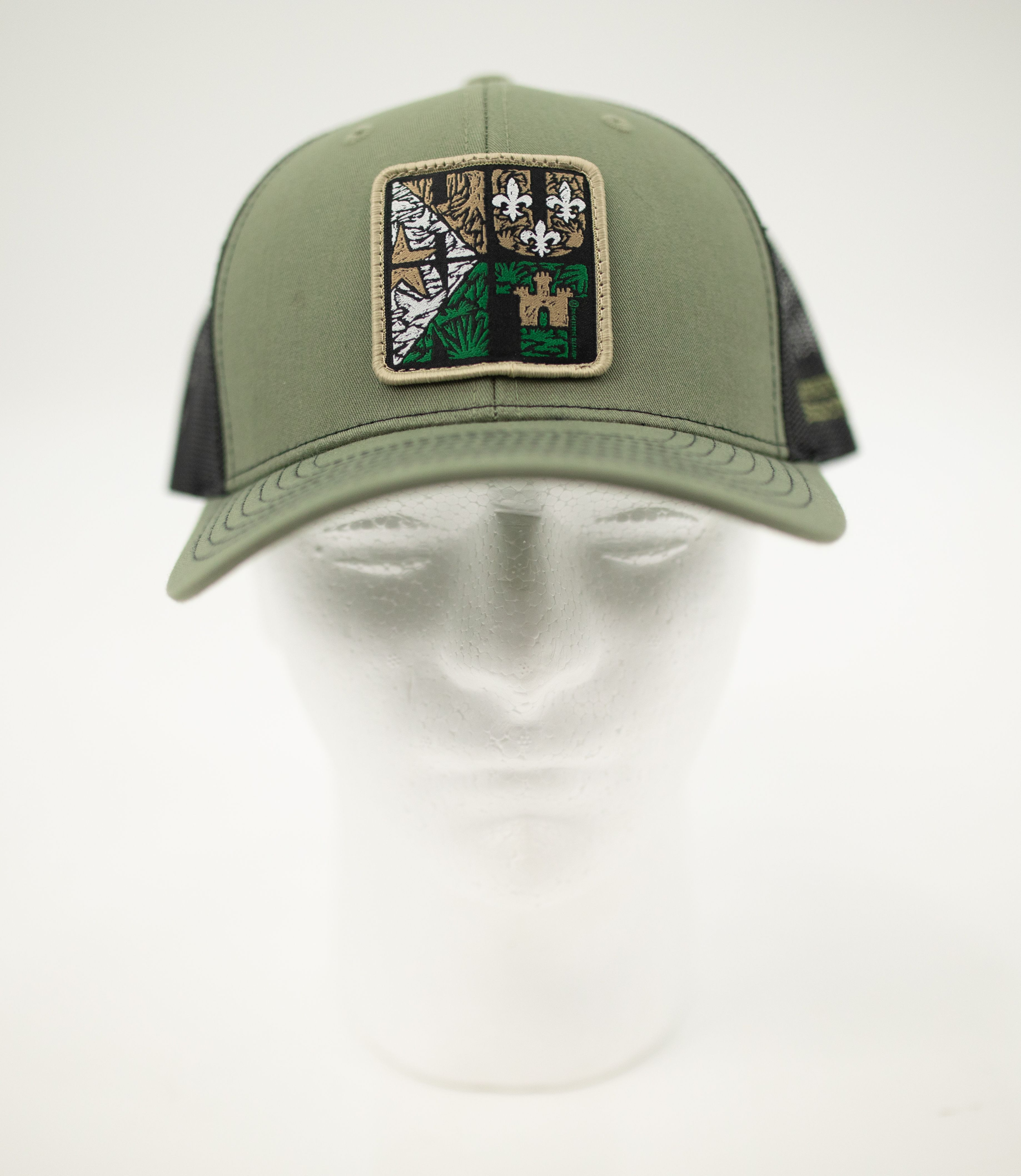 Show your Louisiana pride with this classic mesh-back trucker hat, available in olive green or earthy brown. The front patch features the bold “HUNT” design, filled with the symbols that define the Bayou State — from cypress swamps and wild marsh grass to the fleur-de-lis and historic forts. The breathable mesh back keeps you cool whether you’re out on the water, exploring the marsh, or enjoying a festival downtown, while the curved bill offers shade and comfort. Built for everyday wear, this hat blends Southern tradition with rugged outdoor style, making it a true Louisiana essential.